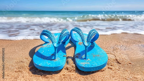 A pair of blue flip-flops abandoned on a sandy beach under the bright sunny day with waves gently crashing nearby