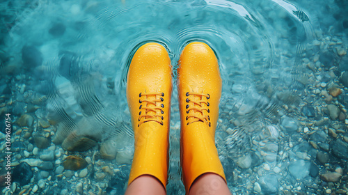 a pair of bright yellow rain boots submerged in clear water with ripples, viewed from above, conveying themes of rainy weather, outdoor activities,