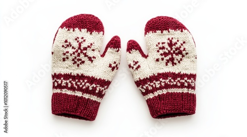 A pair of cozy, red and white Christmas mittens with a snowflake pattern, lying flat on a white background.