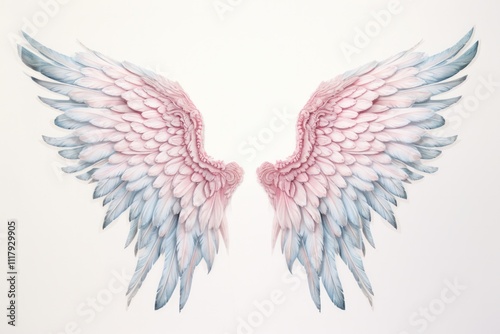 A pair of elegant angel wings, softly feathered and intricately detailed, positioned majestically with a gentle curve. The wings showcase a gradient of white to soft pastel shades