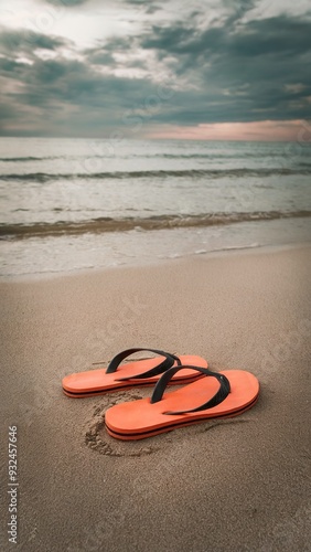 A pair of flip-flops lying on the sand. The flip-flops are orange with black straps