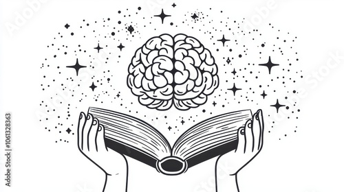 A pair of hands holding a book with an open brain symbolizing learning and understanding, simple line art, black and white.