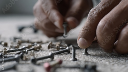 hand, screw, workbench, selection, precision, dexterity, tool, project, manual, sharpened, workshop, metal, assembly, hardware, detail, craftsmanship, labor, work, scattered, attention, piece, metallic, building, construction, pile, sorting, concentrated, technical, mechanic, handcraft, process, material, closeup, skill, concentration, workplace, accuracy, detail, industrious, working, exactitude