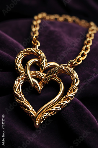 A pair of intertwined heart-shaped necklaces resting on a velvet cushion, symbolizing the eternal bond of love and affection for Valentine’s Day.