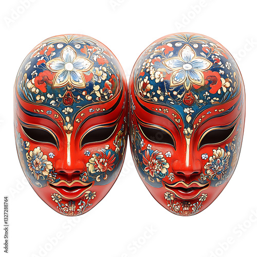 A Pair of Red Chinese Opera Masks with Bold Colors Isolated on Transparent Background