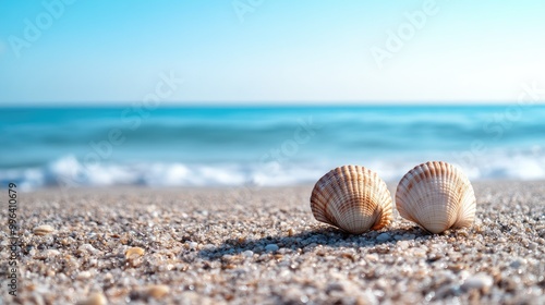A pair of seashells resting side by side on a quiet beach, with the blue horizon of the sea barely touching the sky.