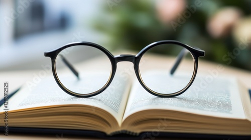 A pair of stylish round glasses rests on an open book, highlighting the themes of reading and knowledge.