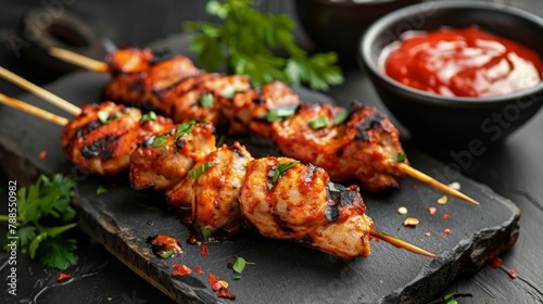 A pair of succulent grilled chicken skewers served with a zesty dipping sauce, tempting the viewer with the irresistible aroma of barbecue.