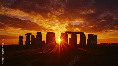 A panoramic shot of Stonehenge at dusk, with the ancient stones silhouetted against a stunning sunset, creating a dramatic and mystical scene in the United Kingdom