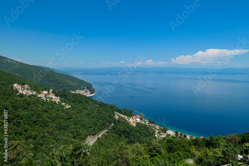 A panoramic view from above of the shore along Moscenicka Draga, Croatia. A few small towns located on the shore of the Mediterranean Sea. Lush green hills along the hills. Sunny day.