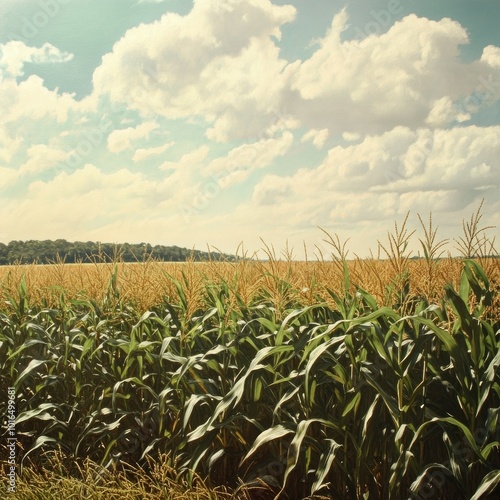 A panoramic view of a cornfield with tall green stalks swaying gently in the wind, under a partly cloudy sky