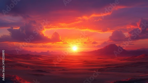 A panoramic view of a desert sunset, with the sky painted in rich hues of orange, pink, and purple as the sun dips below the horizon.
