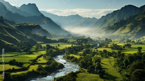 A panoramic view of a lush tropical valley, with mist-shrouded mountains and cascading waterfalls creating a breathtakingly beautiful landscape of untouched natural beauty. Minimal and Simple,