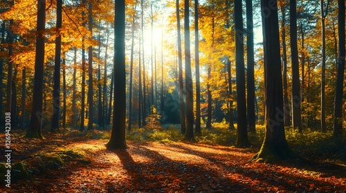 A panoramic view of an autumn forest with tall trees and vibrant leaves, showcasing the beauty of nature in its changing seasons