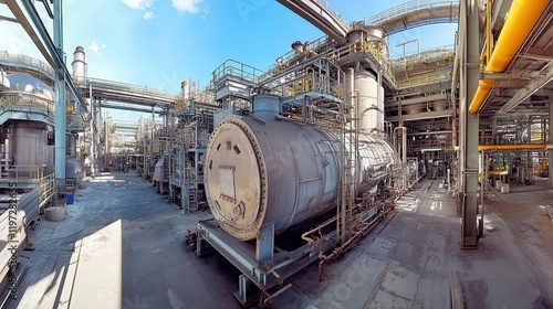 A panoramic view of an industrial boiler operating within a large petrochemical complex, emphasizing scale and industrial design.