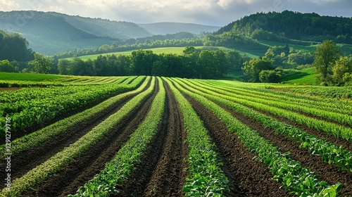 A panoramic view of an organic farm with multiple crops growing in separate rows, demonstrating sustainable and eco-friendly cultivation.