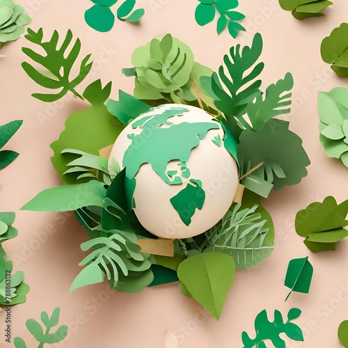 A paper globe surrounded by a lush landscape of paper plants, creating a miniature world.