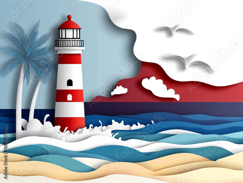 A paper-cut illustration depicts a red and white striped lighthouse on a sandy beach with palm trees, waves, and seagulls under a blue sky with clouds.