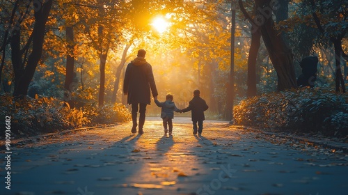 A parent and two children enjoying a sunset stroll through a tranquil forest in autumn, surrounded by vibrant foliage