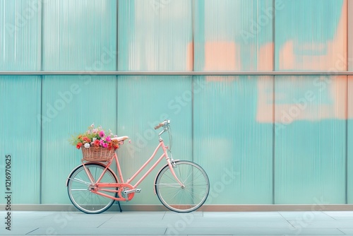 A pastel-colored bicycle with a basket of flowers, parked near a modern glass building. picture