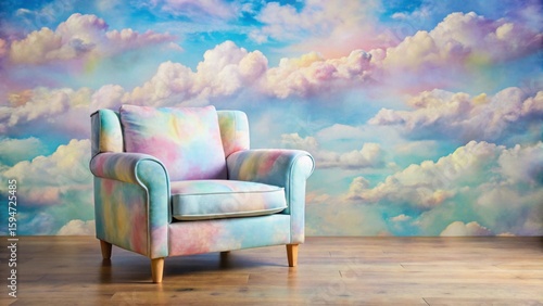 A pastel-hued armchair sits serenely against a dreamy cloudscape backdrop, evoking feelings of tranquility and whimsical escape.
