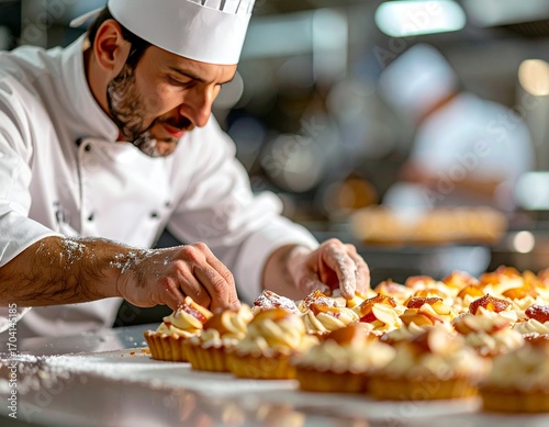 A pastry chef's table with apple desserts mid-preparation, styled dynamically
