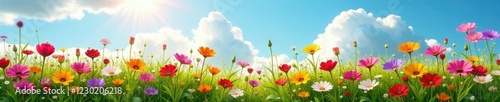 A patch of colorful flowers blooms in the sunlight, nature, landscape, fluffy clouds