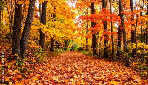 A path winds through a forest ablaze with vibrant autumn foliage, leaves carpeting the ground