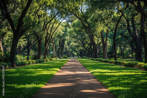 A pathway lined with trees in a park. Perfect for showcasing a peaceful and serene environment.