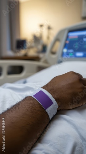 arm, wrist, band, purple, white, skin, hospital, medicals, patient, bed, care, health, treatment, monitor, display, screen, closeup, detail, inside, indoor, sleeve, wristband, disease, disease, exam, pulse, vital, signs, information, human, body, unwell, waiting, room, clean, linen, soft, light, blurry, background, therapy, perspective, focused, foreground, colours, contrast, calm, area