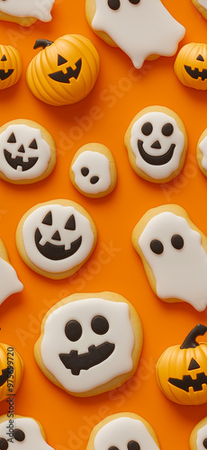 A pattern of cookies in the shape of smiling ghosts and pumpkins on an orange background. Halloween pattern