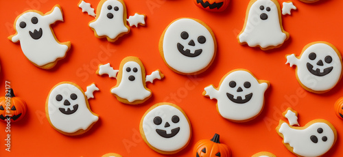 A pattern of cookies in the shape of smiling ghosts and pumpkins on an orange background. Halloween pattern