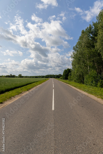 a paved road in rural areas in the summer with cloudy weather and a sky with lots of clouds, a narrow country road covered with asphalt