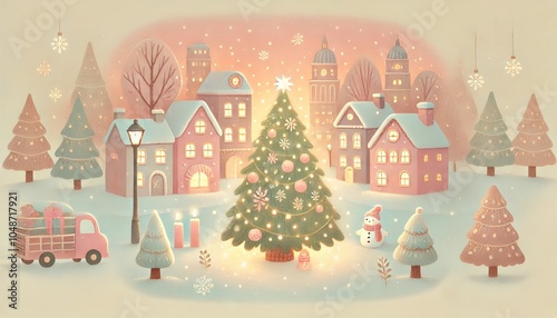 A Peaceful Christmas Day: A Softly Glowing Christmas Tree Lights Up a Pastel-Colored City, Capturing the Gentle Spirit of a Winter Holiday with a Children's Book Style