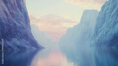 A peaceful fjord with towering cliffs on either side and calm waters below, the sky above a soft pastel hue