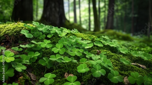 A peaceful forest scene glows with vibrant green clovers scattered across the lush floor.