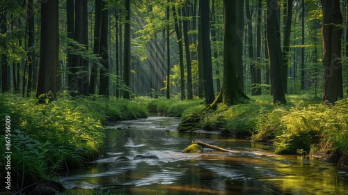 A peaceful forest stream winding through tall, green trees -
