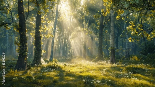 a peaceful forest with sunlight filtering through the trees, soft shadows and gentle light