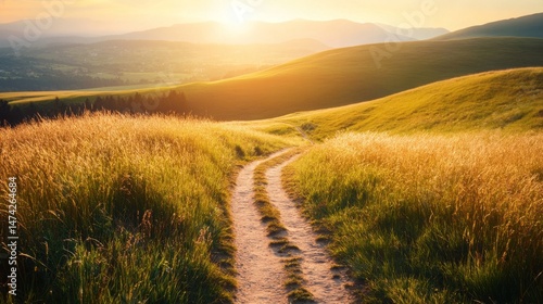 A peaceful morning hike through rolling golden hills, with the sun casting long shadows and a sense of tranquility, the path leading toward an unknown adventure