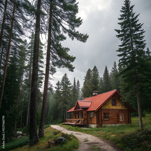 A Peaceful Mountain Cabin Surrounded By Tall Pine,
