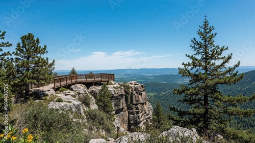 A peaceful natural setting with a wooden observation deck perched on rugged stone, surrounded by thick greenery and lofty pine trees beneath a sunny sky.