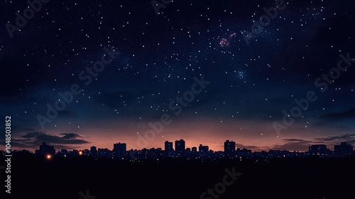 A peaceful night sky with the silhouette of a city skyline, the dark buildings standing against a starry sky as lights flicker in the distance