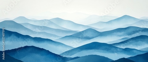 A peaceful scene depicting layered mountains in hues of blue and green, evoking a calm ambiance with a gentle, gradient sky