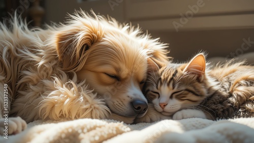 A peaceful scene of a dog and cat cuddling together, showcasing friendship and tranquility in soft sunlight.