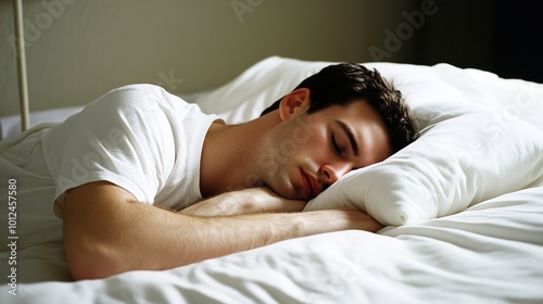 A peaceful side view of a man sleeping in bed, captured in profile as he enjoys a restful slumber. The serene atmosphere is enhanced by soft bedding and a calming environment,