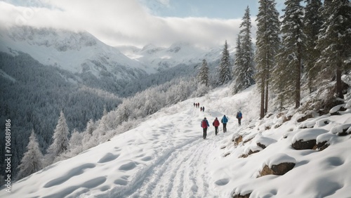 A peaceful snowy mountain scene, with a group of hikers making their way up a winding trail, surrounded by towering trees and snow-covered rocks.