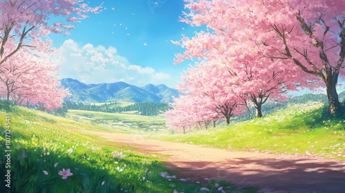 A peaceful spring landscape with blooming cherry blossoms lining a path.