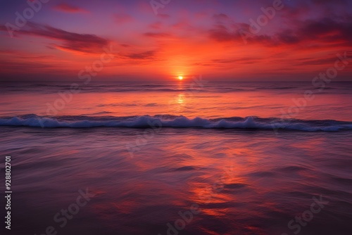 A peaceful sunset over a calm ocean with the sky painted in rich reds oranges and purples, AI Generated