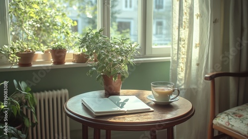 A peaceful therapy room with a small table, an open notebook, and a cup of herbal tea, bathed in natural daylight.
