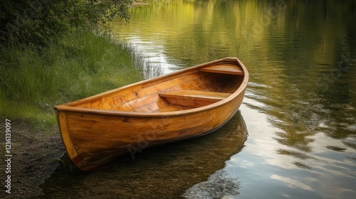 A peaceful wooden boat rests on the tranquil water's edge lake river